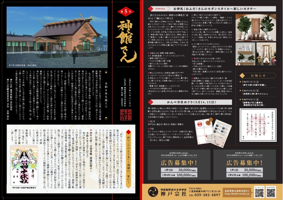 神戸町の皆様のお蔭を頂きながら、今日も神戸宗社は、皆様のお宮(氏神様)として存立できています。この本誌発刊を通じて、神社や神戸町の歴史や文化、日々の様子等を皆様と共有し、自身も一層深めていく所存です。皆様にとって、神戸宗社が、祈りの場・集いの場・癒しの場で在れるよう。また、神戸町に安心・連帯・誇りが感ぜられるよう。